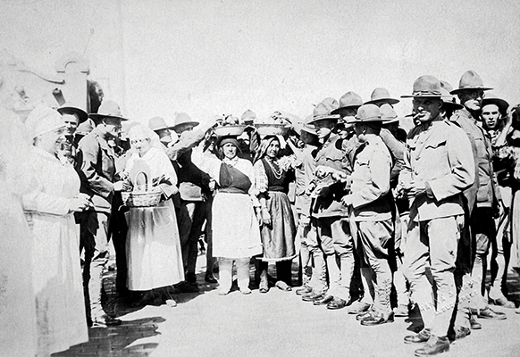 The Red Cross and Native American women giving “the boys” fruit, cigarettes, and handkerchiefs, ca. 1918. Courtesy of the Center for Southwest Research, UNM, Number 000-885(8)-0012.