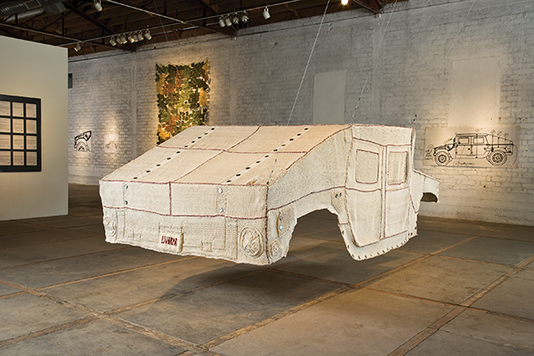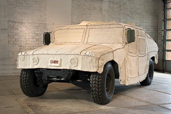 The artistic heart of Love Armor—in 2008 and now—is a hand-knitted protective cozy for the iconic Humvee. Ten years ago, Klinghoffer and her collaborators, recognizing the meditative and therapeutic qualities of knitting, recruited fiber artists from across the country to contribute panels, that, when sewn together, fit like a cozy over the two-and-a-half-ton vehicle. New Mexico soldiers took part in the unveiling of the cozy at the Center for Contemporary Arts (CCA), and the event made national and international news.