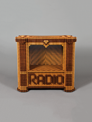 Artist Mike Amersek’s grandson was inspired by MOIFA’s exhibition No Idle Hands: The Myths and Meanings of Tramp Art to donate an intricate “Crown of Thorns” radio cabinet. The artist, originally from Sevnica, Slovenia, moved to the U.S., eventually settling in Carlsbad, New Mexico and Jerome, Arizona. He picked up the puzzlework woodworking style from a man who learned it while in prison in Yuma, Arizona. When grandson Philip Amersek and his wife Caroline Amersek passed the piece along, it came with an accompanying envelope stating it had “no glue no nails used” and that it was made from “12,774 sticks of wood.”
