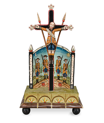 Two items on display are part of a large bequest of 167 objects by the late Dan Prall, who was a dedicated volunteer at MOIFA for nearly 18 years, and a passionate collector of traditional and contemporary Spanish Colonial and Native American art. These items include a hand-adzed, carved, and painted cabinet by furniture maker Raymond J. López of Santa Fe, and a hand-carved and painted bulto (three-dimensional image of a saint) of San Acacio by santero artist Gustavo Victor Goler of Taos. From the religious to the decorative to the utilitarian, the larger group of objects represents the breadth of Prall’s collecting passion and his joy in getting to know the artists.