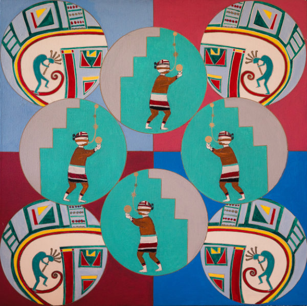 Greg Cajete, Offering to the Sacred Directions, 2015. Acrylic painting, 48” × 48”. Detail of the paintings on the right. This image appears on the cover of his book, Indigenous Community. Photograph by Isabel Miranda.