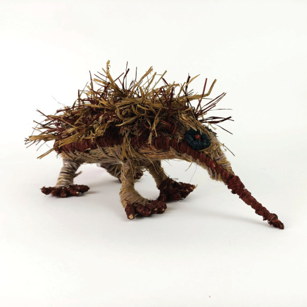 The raffia used to make their fiber art is soaked in an old bathtub with a fire underneath. After cooking, it is hung longwise between the trees to dry. The grass coil baskets can be made relatively quickly, while the sculptures take more time. Wool is often used to give form and structure to more intricate shapes. Artists also incorporate string, wire, animal fur, beads, seeds, and found objects. Each piece is considered a story, passing down ancestral knowledge and honoring the rhythms of the land. The communities are deeply rooted in the area, having continuously occupied the Australian continent for fifty thousand years. Their art is thus embedded with spiritual and practical connections to ecology. Referred to as Dreamtime or Tjukurrpa, this is a set of teachings that underpin an understanding of the world, its creation, its great stories, and its spirit ancestors who created everything. These Law stories teach the wisdom of an unchanging network of relationships between the human and non-human world, which can be traced back to the beginning of time.