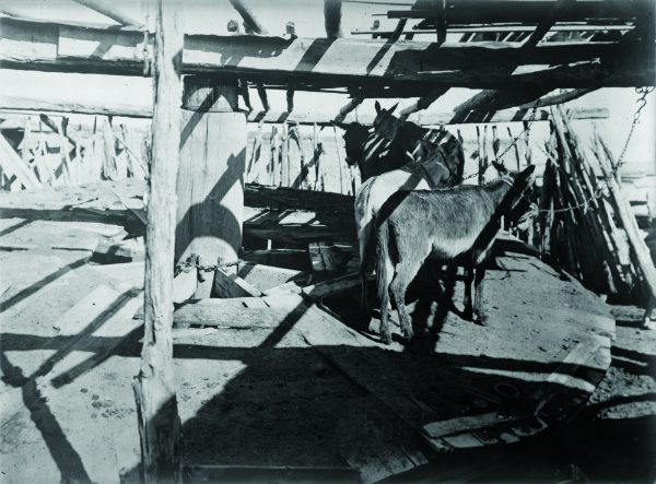 Further south, at Angostura near Algodones, Felipe García built a molino propelled by a large wheel, thirty to forty feet in diameter, slanted on an axle. Four burros walked along a wheel platform while rotating the axle as the wheel revolved in a contrary direction under the weight of their steps. A rawhide rope was strapped around the rim of the platform, then passed into two openings of an adjacent adobe building, leading to a smaller wheel and the millstones. Troughs holding the ground grain separated the bran, the whole wheat, and the white flour. Travelers who passed through the area remarked on the lush fields and orchards that lined the Camino Real in the vicinity of Algodones. Apples, peaches, quince, pears, apricots, and grapes were grown along with corn, chiles, and beans. Elders from the community recall that Felipe García’s molino ground wheat and corn for local Hispano farmers as well as for the Pueblos of Tamayá/Santa Ana, Katishtya/San Felipe, and Kewa/Santo Domingo.