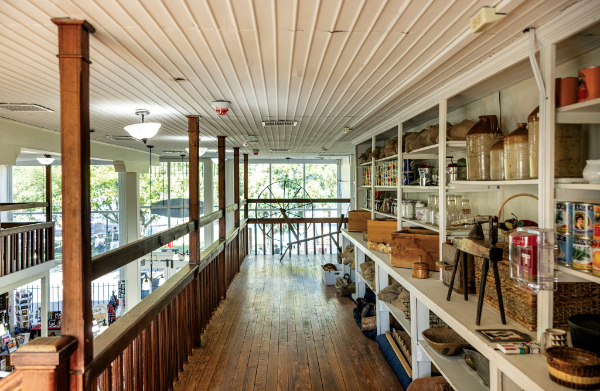 The Reynolds Store Visitor Center is named for Joseph and Charles Reynolds, father and son who owned stores in the building during the late nineteenth and early twentieth centuries. The mezzanine of the center showcases a recreation of what their stores may have looked like. Bottom left: Some of the items on display in the visitor center include educational objects, including this large retablo by Charlie Carrillo, showing San Ysidro, the patron saint of farmers.