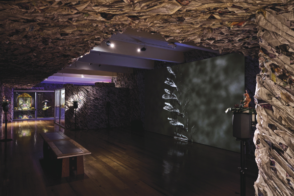 The descent into the depths of the Museum of International Folk Art for the Once Within a Time exhibition involves immersion in paper. Paper forms forest creatures, funeral scenes, and walls, transforming the space into a newsprint cave. At this lair’s heart, a film features paper writhing through a sequence of transformations.