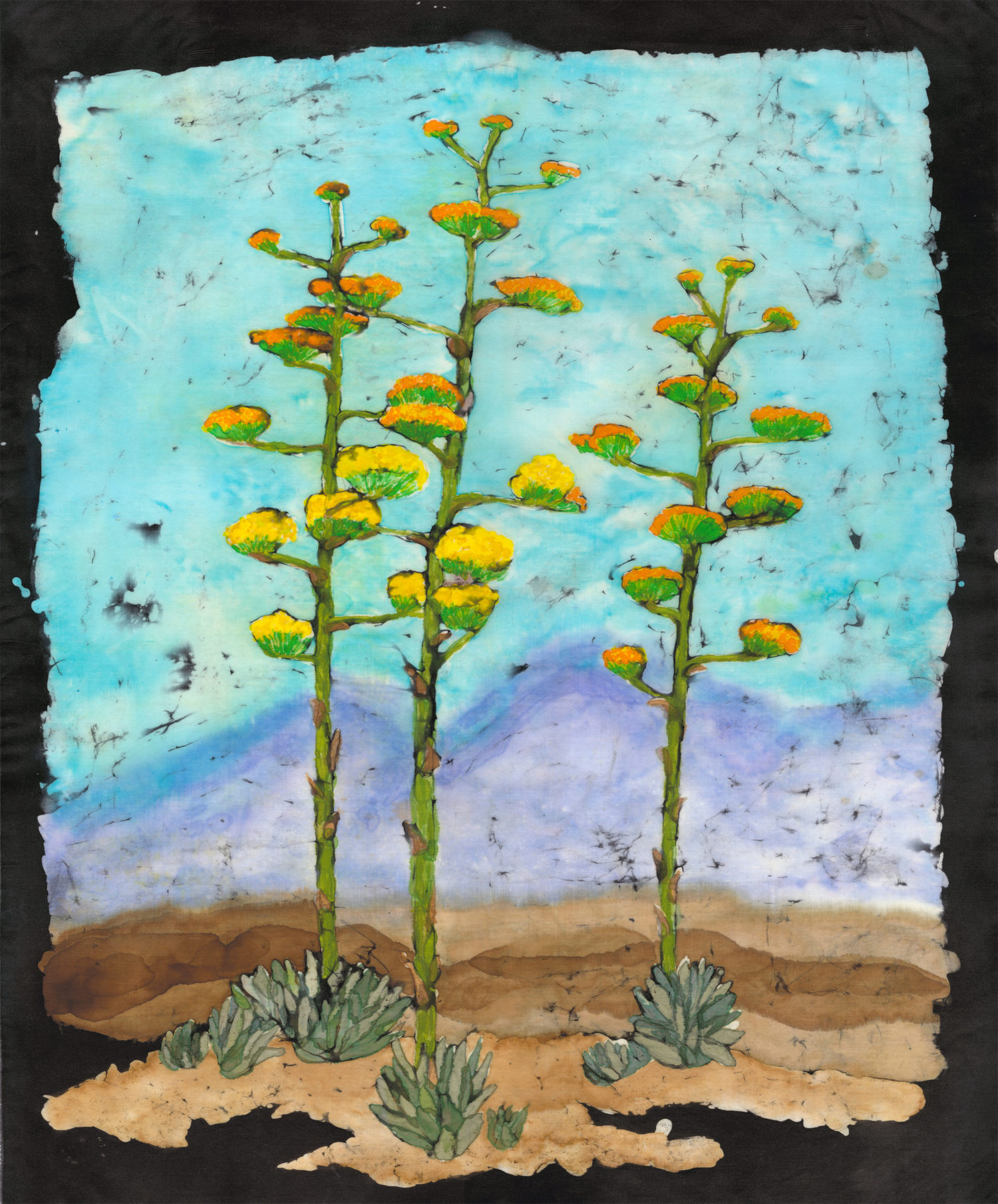 Sandra Hatch. Century Plants with Mountains, 2022. Cotton, fabric dye, wax, 18” x 22.”